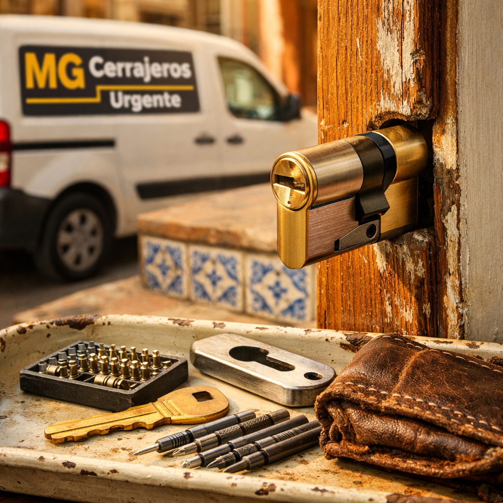 Cerradura euro-perfil en puerta de madera, herramientas de cerrajero y ambiente cálido en calle de Valencia. Cuales son las mejores empresas para cambio de cerraduras en Valencia.